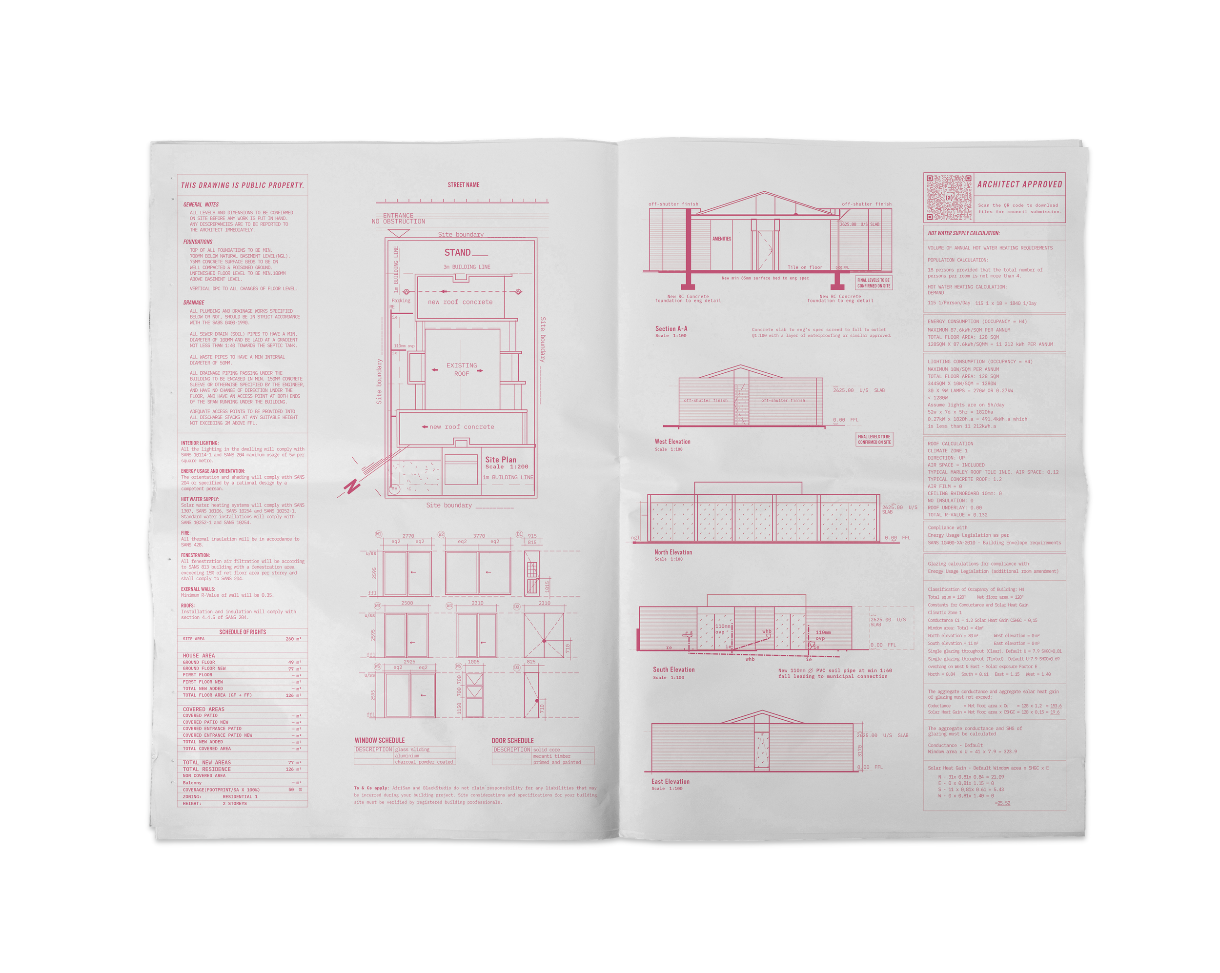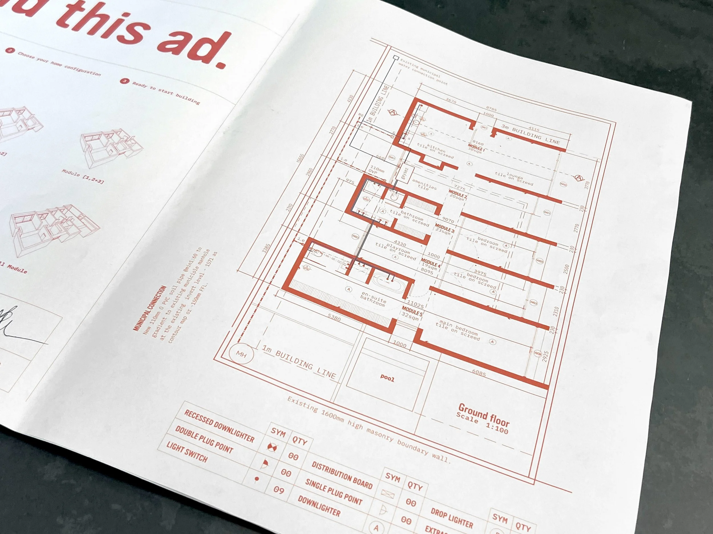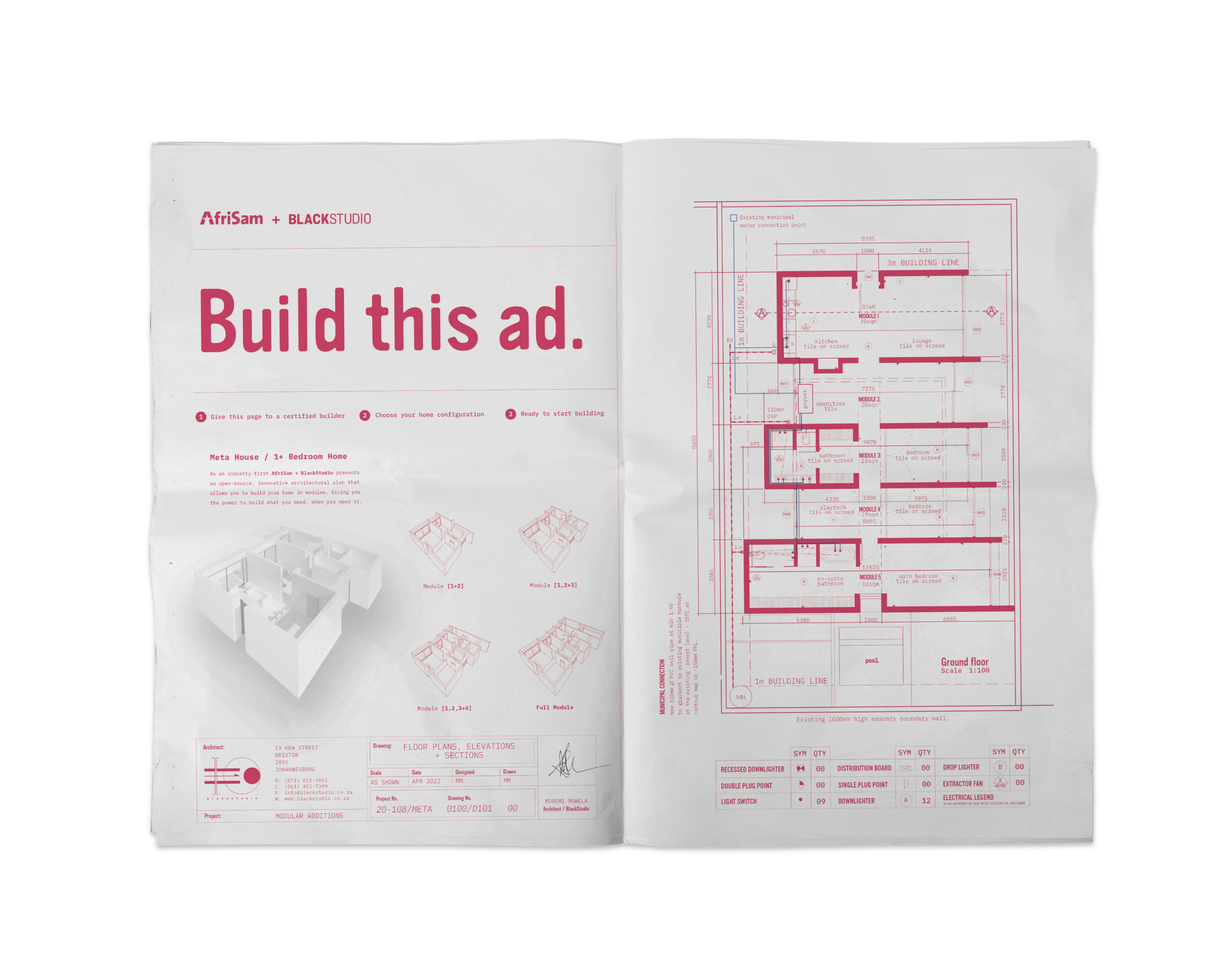 In South Africa, people's homes in underprivileged communities are being demolished by local governments due to not being approved by local council. Legislation states that approval is only granted if planned by a registered professional – a cost far out of reach for poorer communities. AfriSam's press ads were turned into architectural plans for low-cost homes, which can be physically submitted for council approval and used to build directly from by a certified builder – legally.