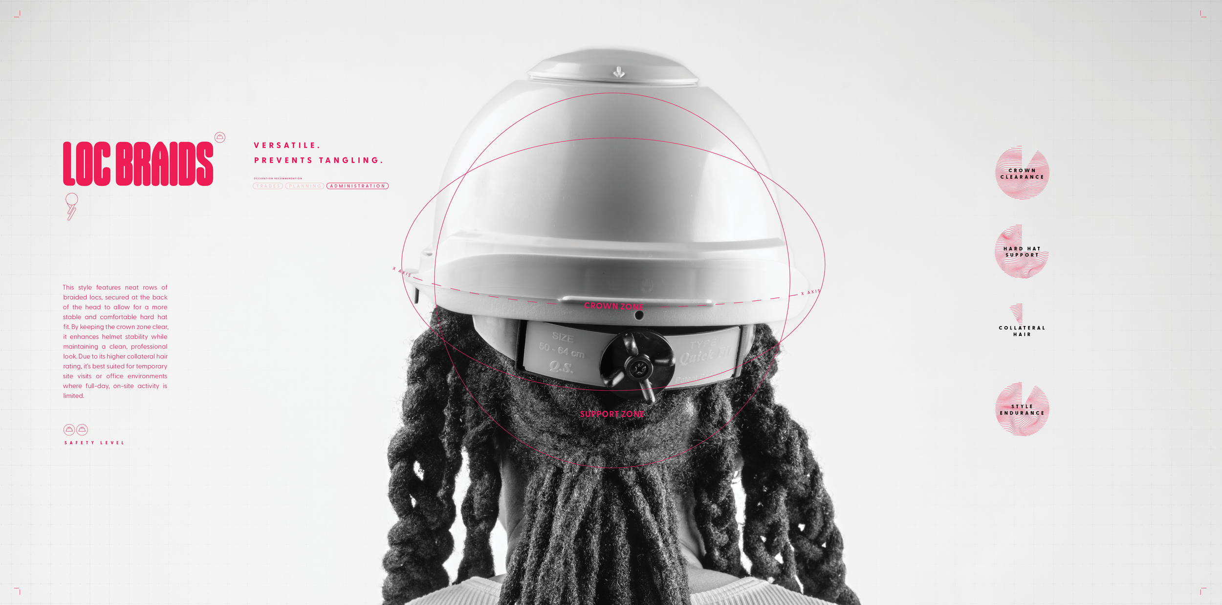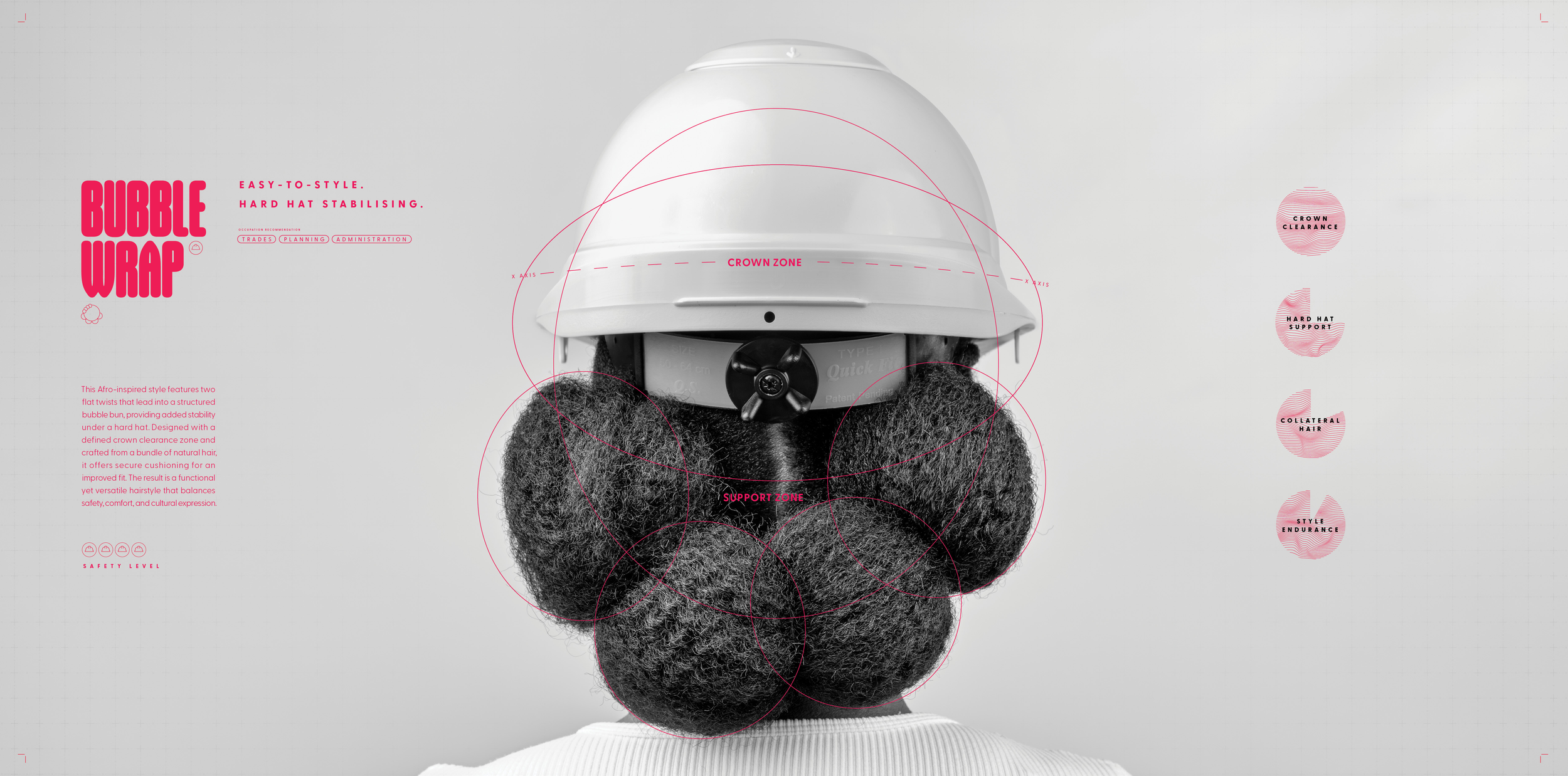Using existing hard hat fit standards as a foundation, we developed each hairstyle with four key safety criteria to ensure optimal protection without compromising cultural expression. Crown Clearance measures how well the hard hat sits on the head, aiming for minimal interference between the scalp and helmet for a secure fit. Hard Hat Support leverages the structural versatility of natural hair to enhance helmet stability, turning hair into a functional support system.
