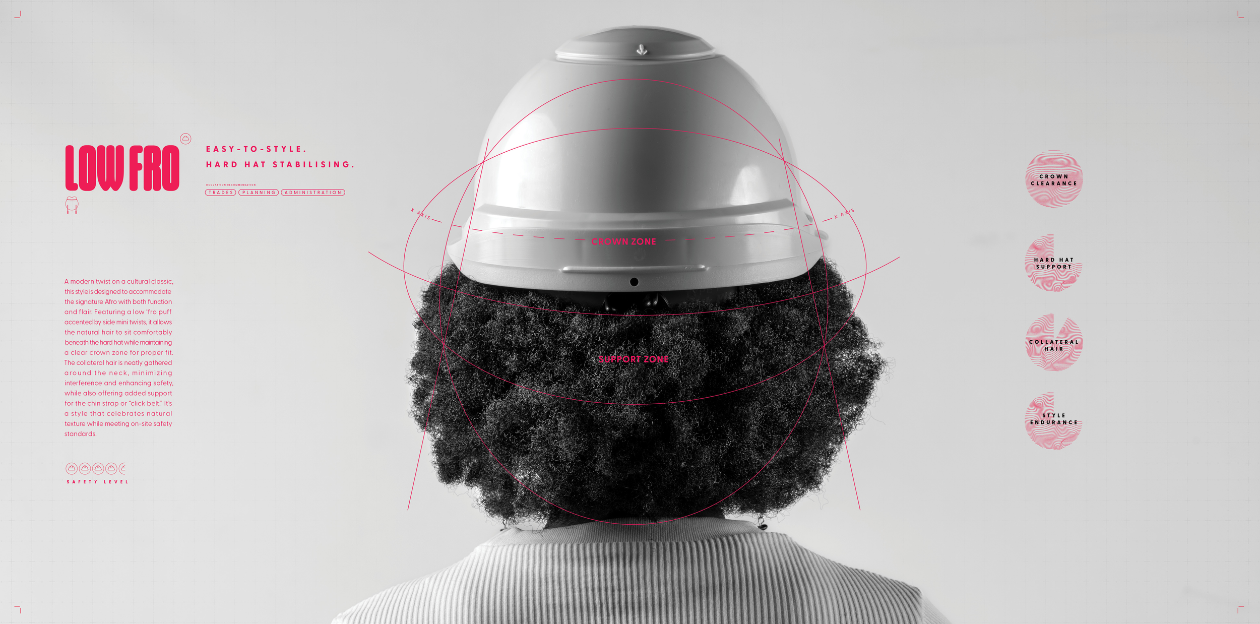 Ergonomic hair designs that make hard hats safer for Black women in construction.